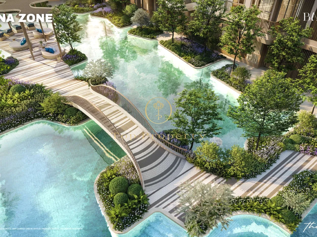 Площадь бассейнов – 3,922 м², зеленых зон – 4,458 м².